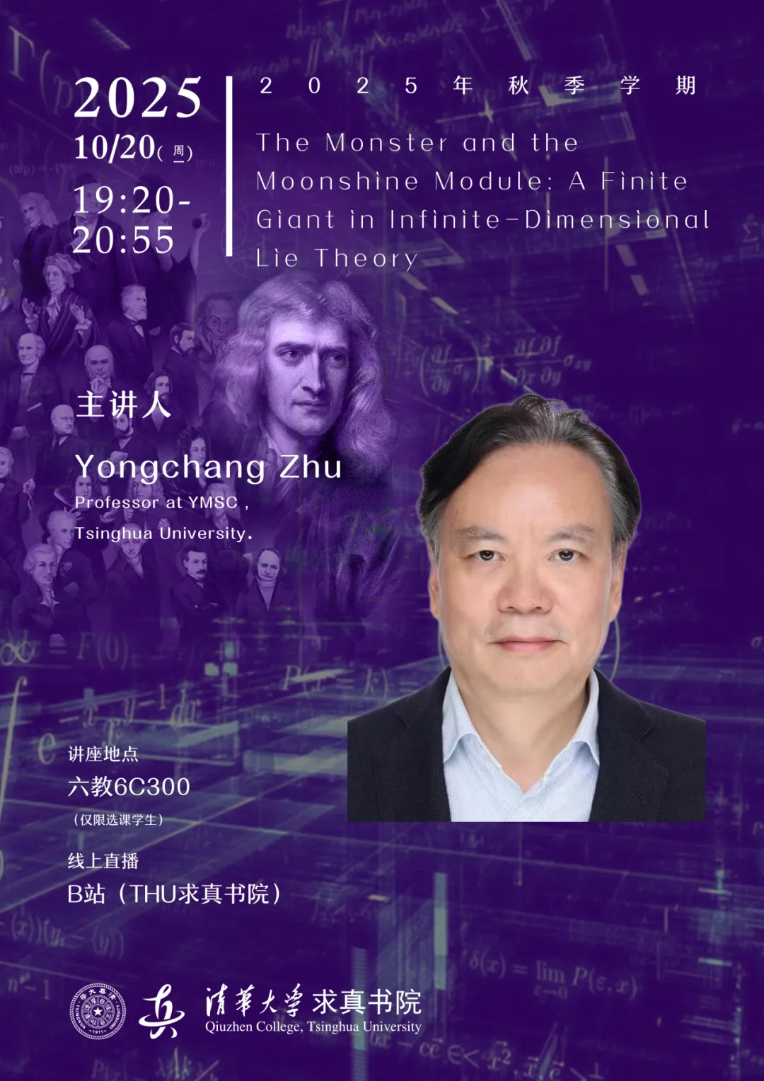 Yongchang Zhu is a professor at YMSC, Tsinghua University. He got his PhD from Yale Univeristy. His research interest is in representation theory, number theory and mathematical physics. He is an invited spearker in 2026 ICM.